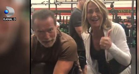 Cei doi buni prieteni s-au intalnit intamplator in sala de fitness, acolo unde Arnold Schawarzenneger isi antrena din greu muschii iar NadiaComaneci il filma. Celebrul actor nu isi arata nici pe departe cei 72 de ani pe care urmeaza sa ii implineasca la sfarsitul lunii si se mentine in forma maxima.