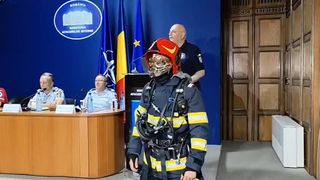 "Peste 24.200 de căști au fost achiziționate din 2017 încoace. Căștile respectă standardul și sunt certificate și acreditate conform normelor în vigoare...", a continuat Arafat, care s-a apropiat de pompierul-model și a prezentat viziera căștii de protecție.