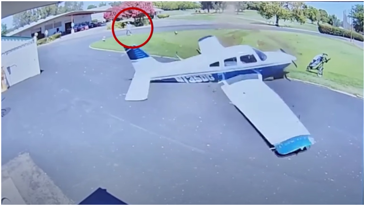 Videoclipul a surprins aterizarea forțată a avionului în Complexul de golf Haggin Oaks, derapând pe teren și evitând de puțin un magazin și o cafenea.
