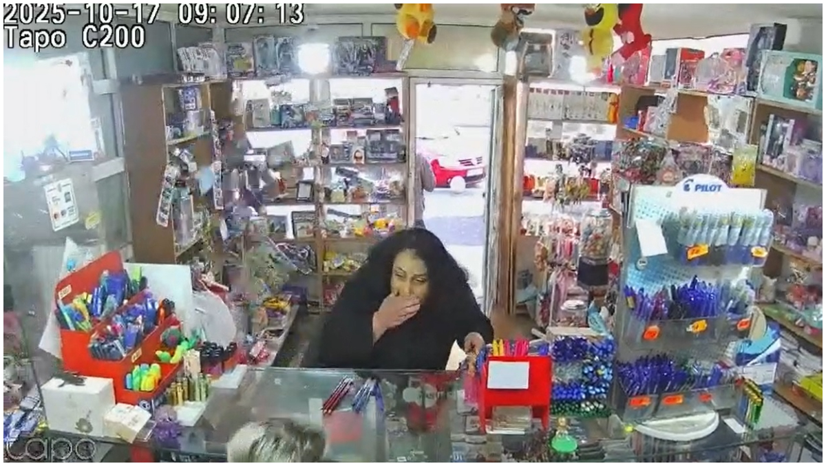În imagini se poate impactul exploziei asupra geamurilor, rafurilor și produselor din magazin.