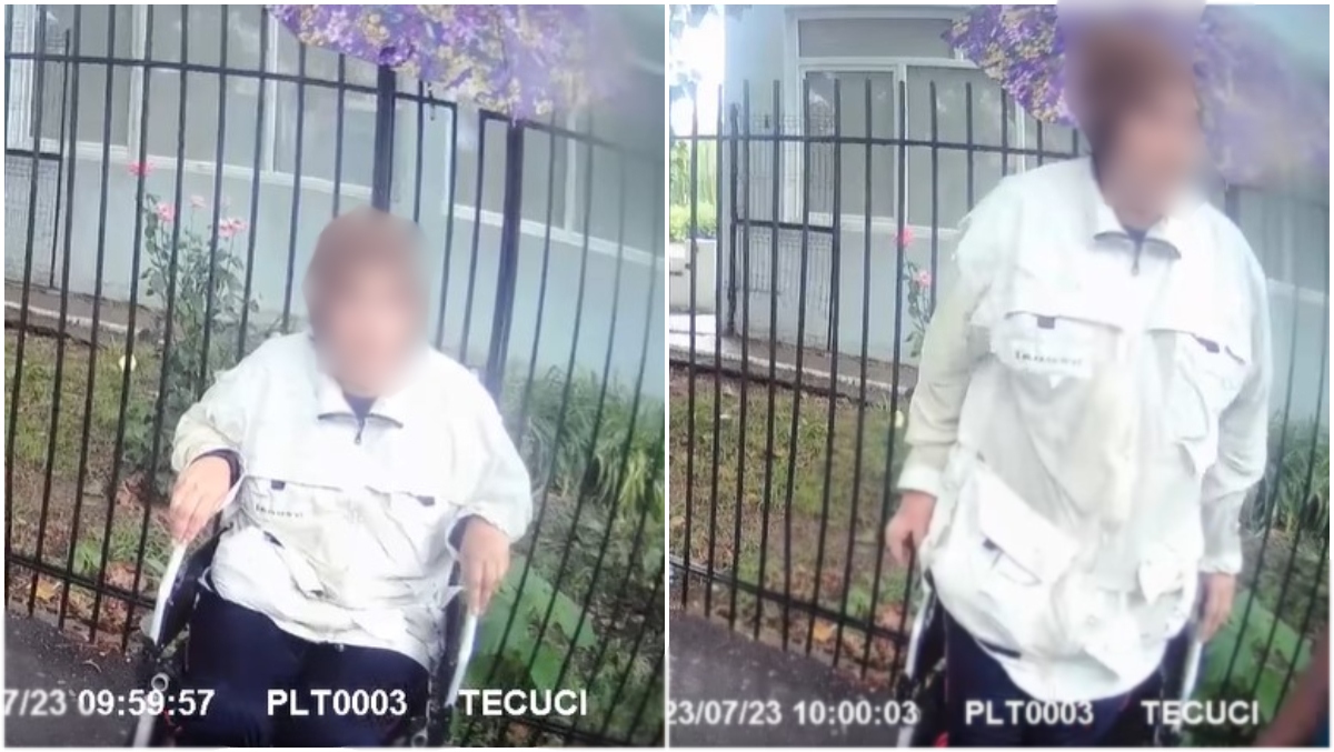 1 din 2 | Momentul în care o cerșetoare în scaun cu rotile din Tecuci se „însănătoșește miraculos”. La vederea polițiștilor, handicapul femeii a dispărut ca prin minune: „Hai sus, ridică-te frumos!