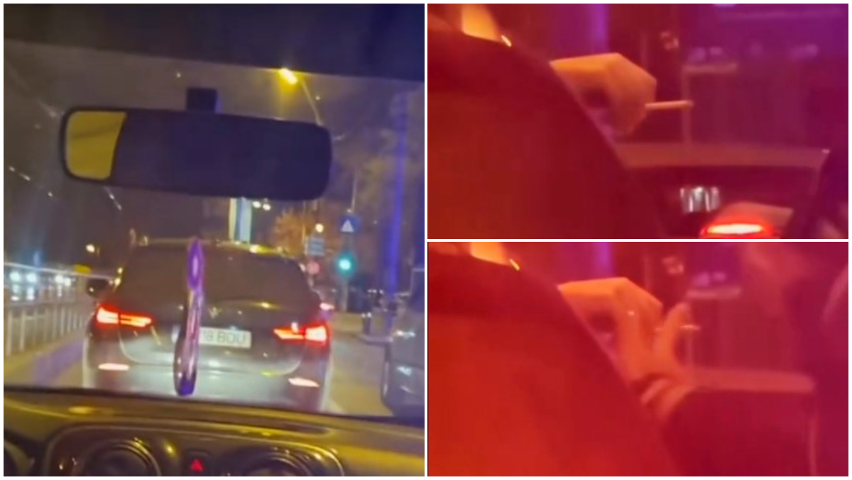 Momente inedite în traficul bucureștean. Pasagerul unei mașini care se afla în trafic i-a furat țigara unui altui pasager care se afla în mașina din față.