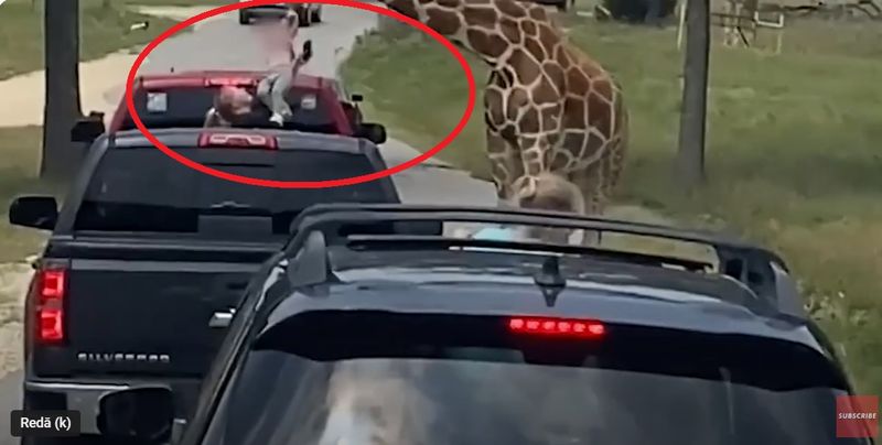 La un moment dat, o girafă se apropie de mașina decapotabilă și devine foarte interesată de mâncarea pe care fetița o ținea în mână.