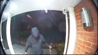 Bărbatul cu glugă este văzut lovind ușa din față a casei cu o sabie de samurai, dar din fericire pentru proprietari arma se rupe în două, iar interlopul se retrage "cu coada între picioare".