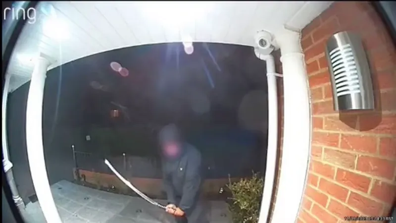 Un bărbat cu glugă și mască medicală, îmbrăcat în negru, apare pe o cameră de înregistrare de la sonerie mânuind o sabie de samurai și lovind în ușa unei locuințe pe care vroia să o jefuiască.