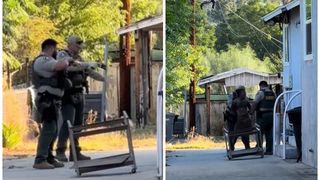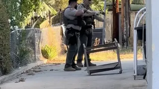 Ambii ofițeri îndreaptă apoi pistoalele către un bărbat în timp ce acesta iese din gaură.