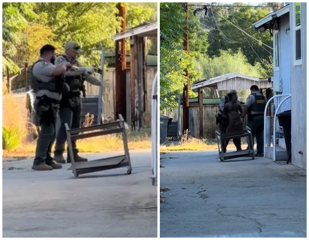 Intrusul este foarte murdar și poartă doar pantaloni scurți fără tricou, el este pus rapid în cătușe de către ofițeri și escortat la secția de poliție.