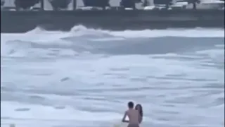 Cuplul a împărtășit un moment romantic înainte de a fi măturați sălbatic de un val masiv de venit din senin. Valul a fost atât de puternic încât amândoi iubiții cad.