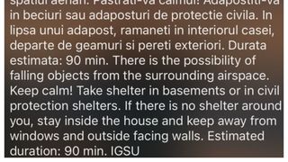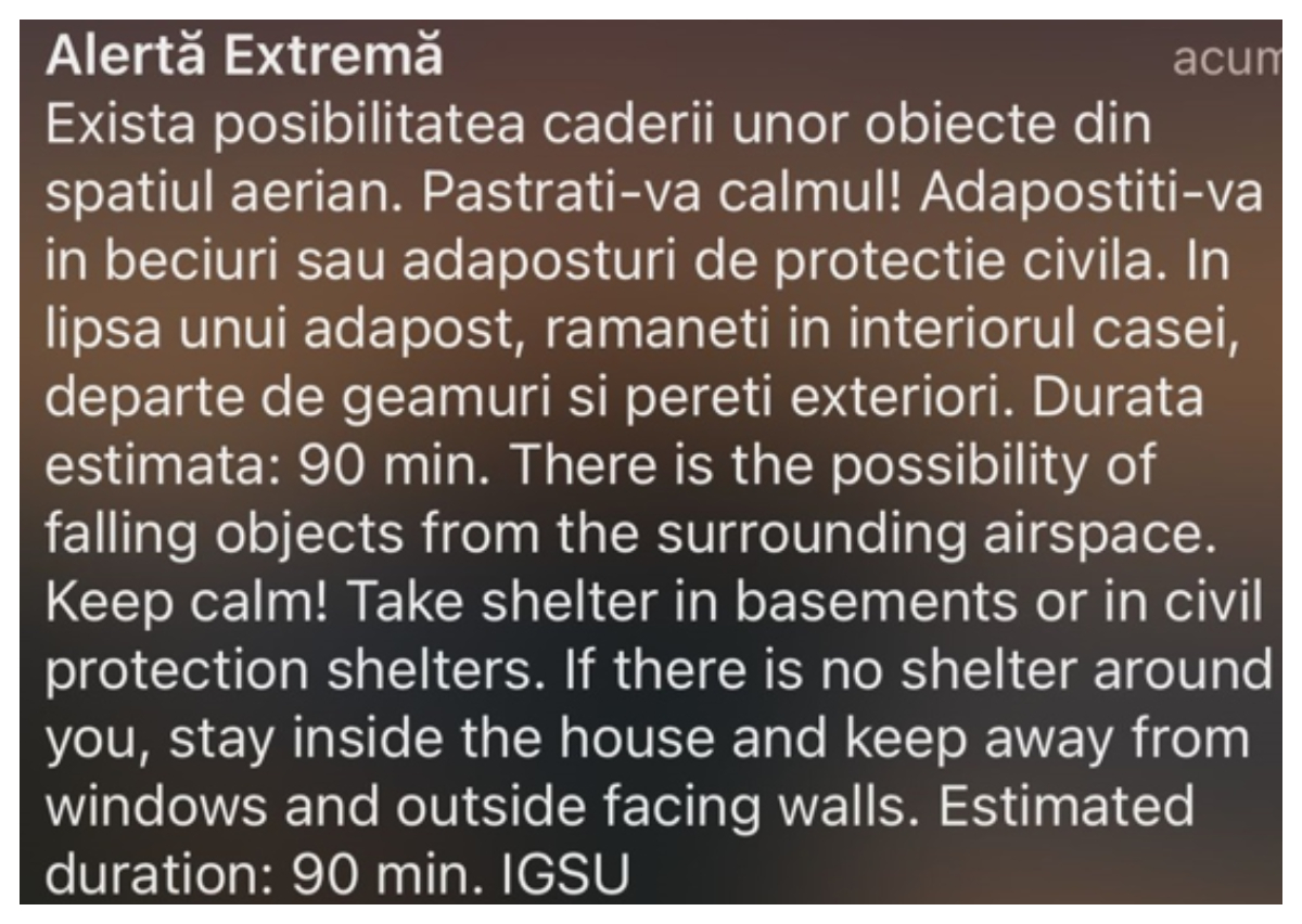 "Facem încă o dată un apel la calm şi readucem aminte cetăţenilor că nu teritoriul României este vizat de atacurile Federaţiei Ruse şi rugăm populaţia să respecte măsurile de siguranţă transmise de autorităţile române, să citească cu atenţie mesajele pe care le primesc din partea acestora, să nu intre în panică şi să anunţe la 112 orice situaţie de urgenţă ori dacă au nevoie de ajutor”, au transmis oficialii de la ISU.