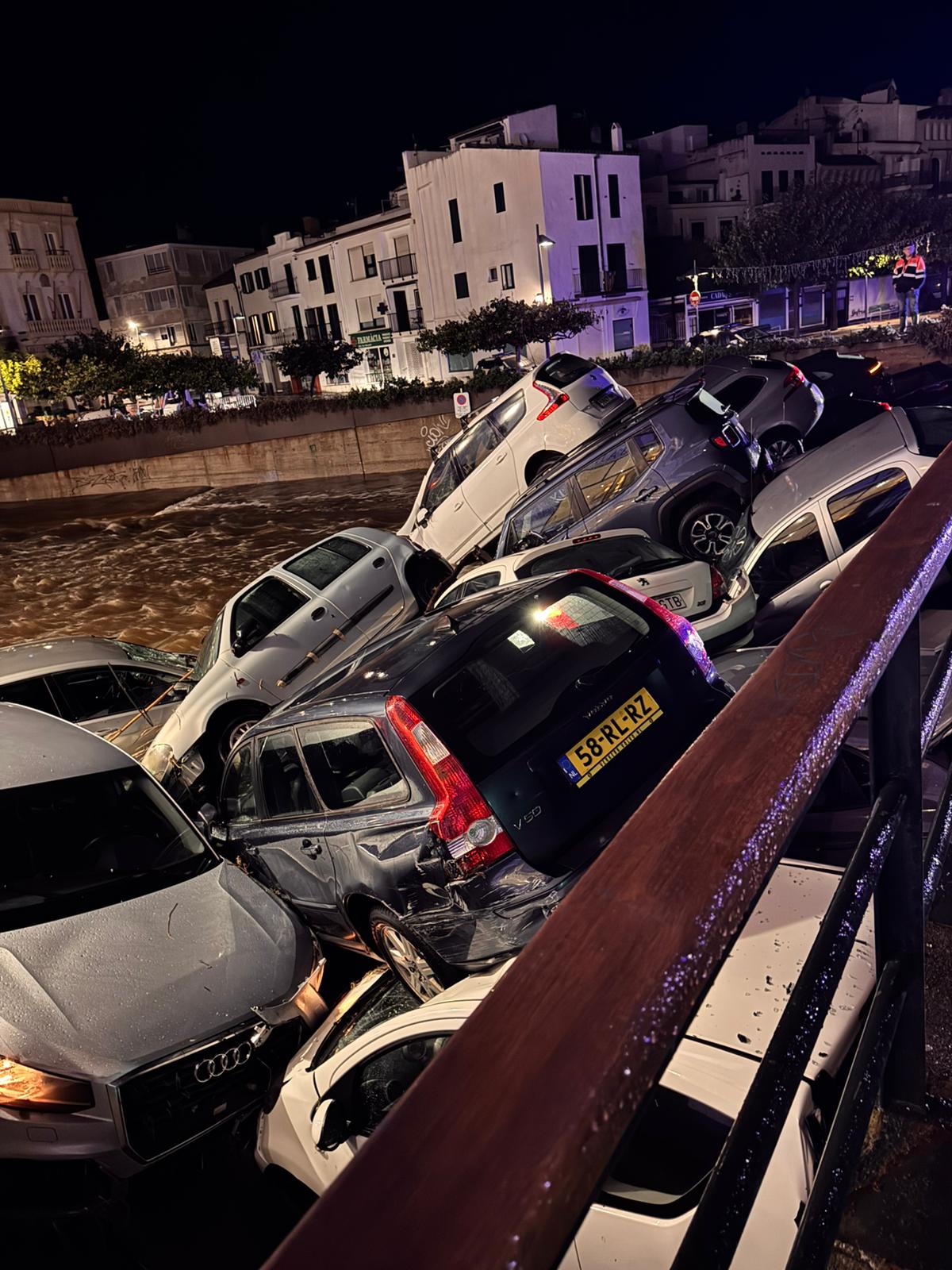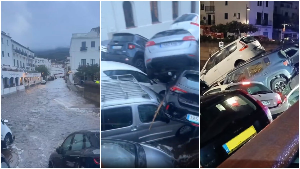 Imagini publicate pe rețelele sociale au arătat mașini duse de ape și răsturnate unele peste altele, după revărsarea unui râu în orașul Cadaques.
