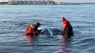 According to the Marine Mammal Stranding Center, the whale was in very shallow… pic.twitter.com/N2hQPV4Sny — Collin Rugg (@CollinRugg) August 3, 2025