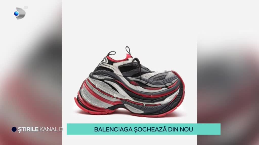 „Casa de modă Balenciaga șochează din nou, de data aceasta cu o pereche de pantofi sport. Adidașii au o formă ciudată, spun fanii brand-ului, și par a fi făcuți din mai multe straturi de material. În plus, au și efectul de pantof uzat și rupt, pe care mulți nu-l înțeleg. Numai luna asta Balenciaga a scos și alte produse bizare, cum ar fi ghetele cu platformă imposibilă sau pungile de rafie imprimate cu legume și fructe. O astfel de plasă se vinde cu 3.000 de dolari”, a transmis Simona Pătruleasa.
