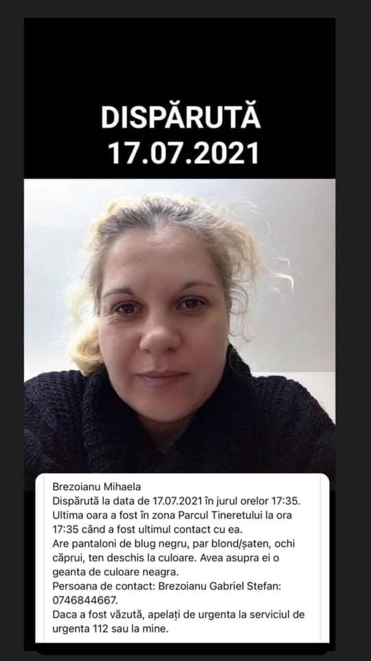 Mihaela Brezoianu are 43 de ani și a fost văzută ultima oară în parcul Tineretului, sâmbătă, 17 iulie, în jurului orei 17:35. Femeia are înălțimea de 1.65-1.67 metri, păr blond-șaten, ochi căprui și tenul deschis la culoare. În ziua dispariției purta blugi albaștrii, un tricou roșu și adidași roz deschis.