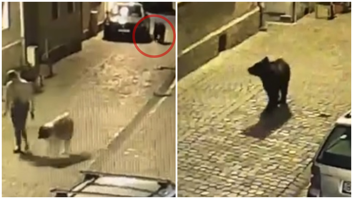 Clipe de groază pentru o femeie din Brașov! În timp ce își plimba câinele pe o stradă din centrul orașului, un urs se afla pe urmele ei. Totul a fost surprins de o cameră de supraveghere.