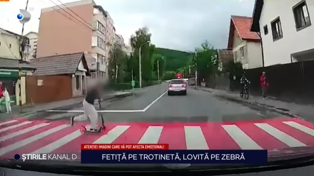 În filmare se vede clar că fata traversează pe trotinetă, dar șoferul nu face niciun gest de frânare. Abia după ce impactul a avut loc, șoferul oprește brusc.