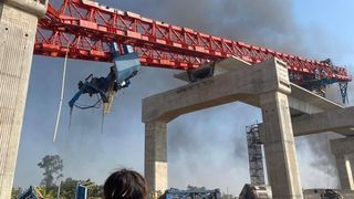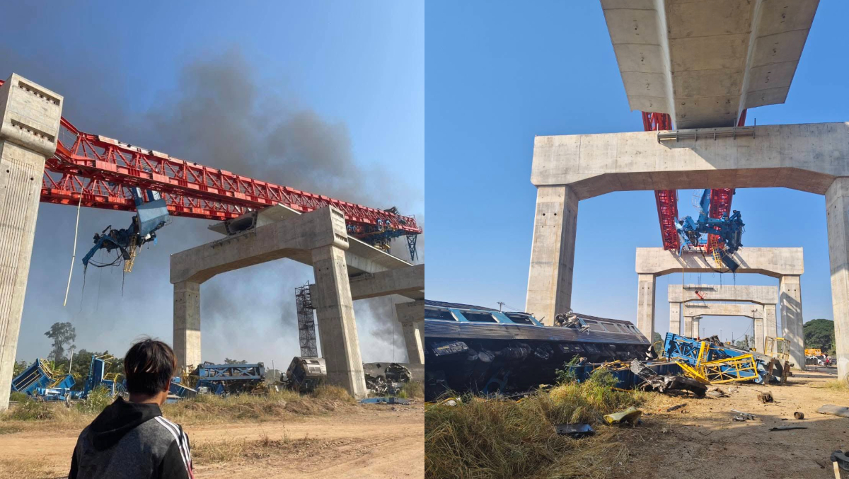 Construction crane for high-speed rail bridge collapsed onto moving passenger train in Sikhiu, Nakhon Ratchasima this morning (14 Jan) at 9:05 am. Train derailed and caught fire. 30+ passengers injured, many trapped in carriages. Multiple rescue teams deployed. pic.twitter.com/X4c0vyQIwA