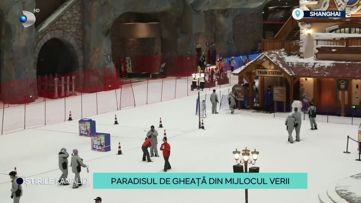„Chinezii au găsit soluția împotriva caniculei. În inima orașului Shanghai, iarna și vara se întâlnesc într-un complex turistic inedit, care combină răcoarea pârtiilor de schi pline de zăpadă cu distracția din parcurile acvatice”.