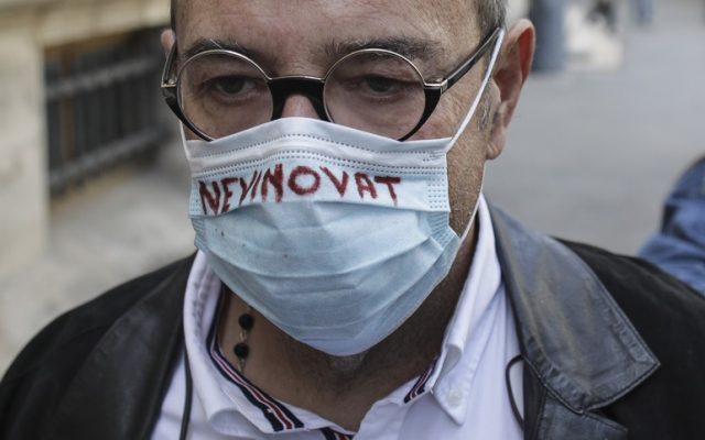 La ieșire a purtat o mască pe care a scris „nevinovat”- dar la fel de nervos a plecat.