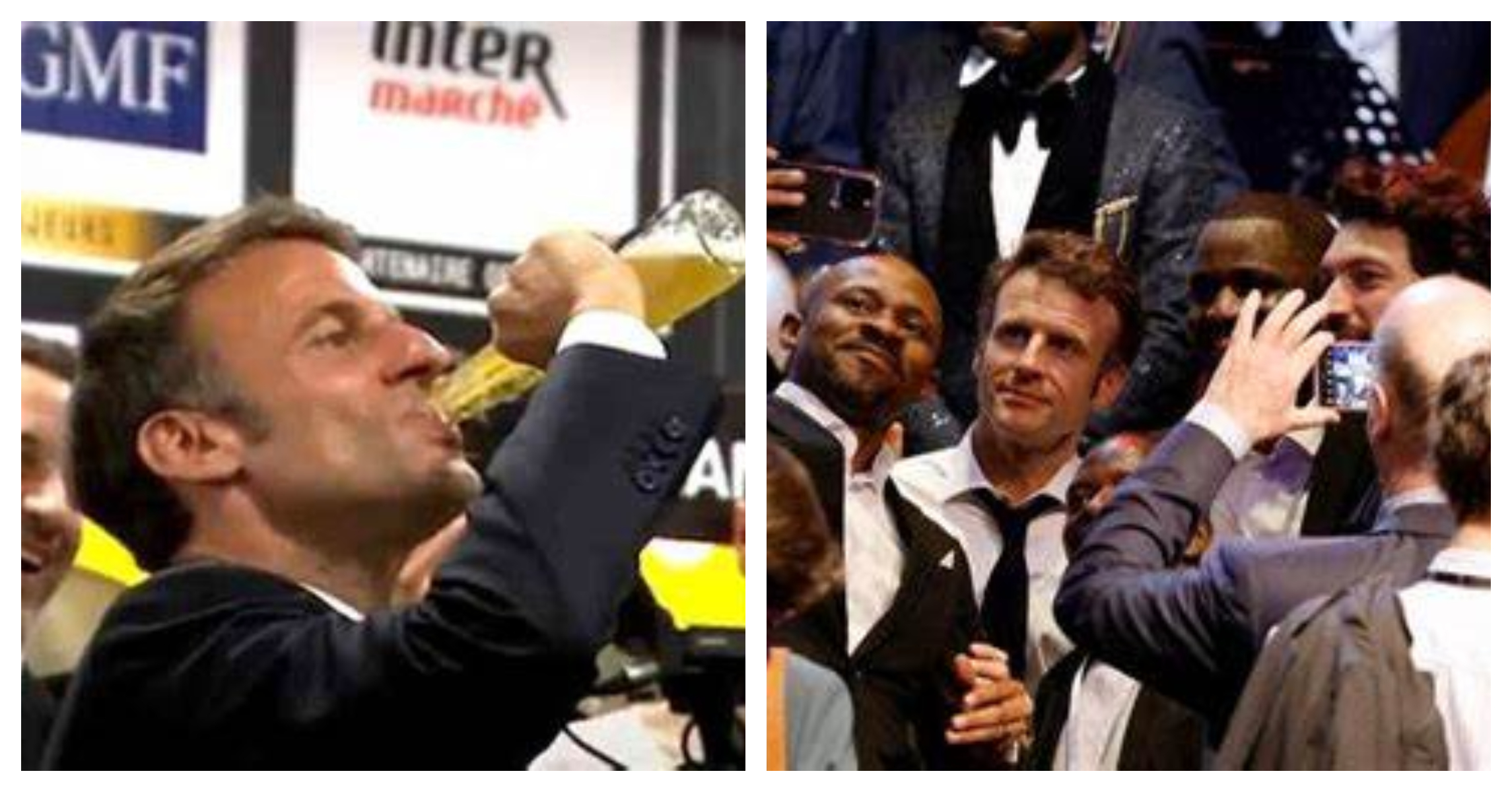 Emmanuel Macron a fost servit cu o bere pentru a sărbători victoria, bere pe care a băut-o în doar 17 secunde, dintr-o singură înghițitură.
