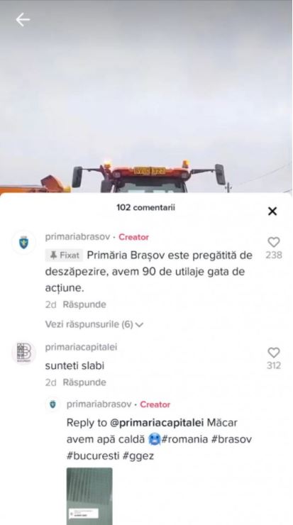 3 din 3 | Primăriile din București și Brașov, replici acide în comentarii și clipuri pe TikTok: ”Măcar avem apă caldă”