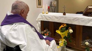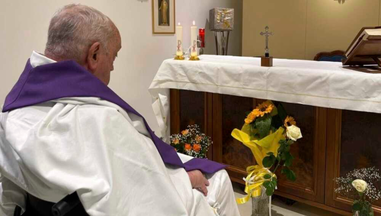 Papa Francisc apare într-un fotoliu rulant, într-o capelă a spitalului Gemeli din Roma.