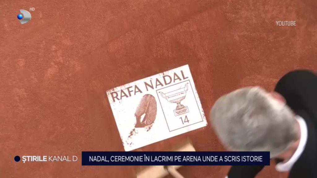 Extrem de emoționat, Nadal a fost invitat pe cea mai mare arena de la Roland Garos, în fața suporterilor îmbrăcați cu tricouri în culoarea zgurii pe care Rafa a scris istorie. Pe un ecran gigant au rulat imagini cu momentele de glorie are marelui campion spaniol. Rafael și-a stăpânit cu greu emoțiile pe arena Filip Șatrie, acolo unde a pregătit un discurs în limba franceză.
