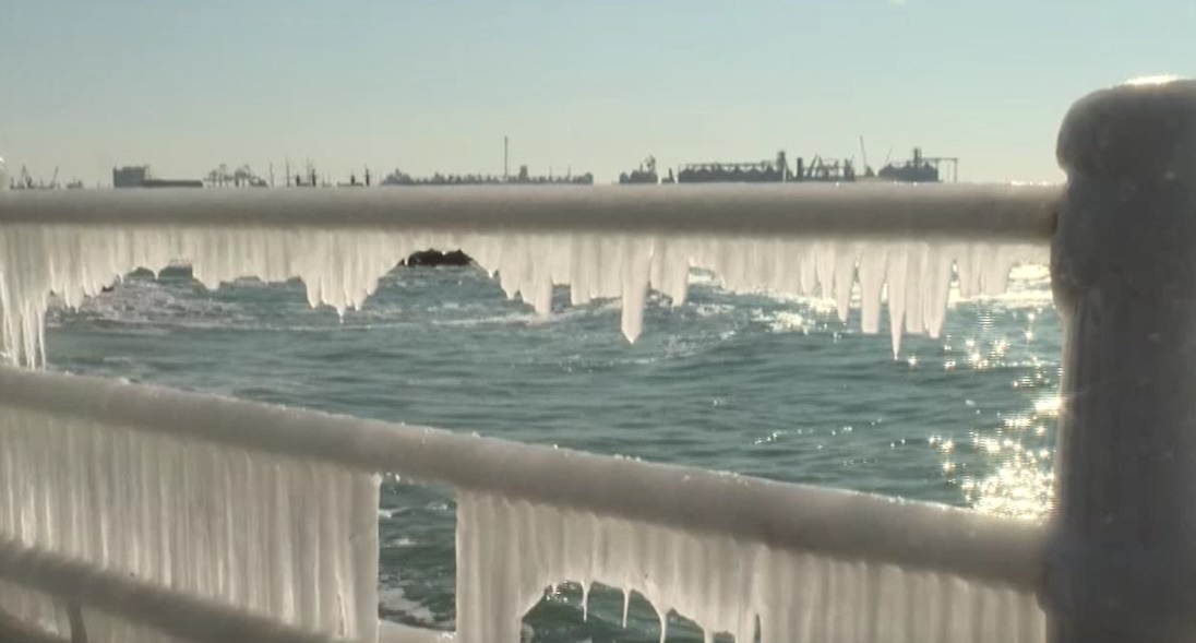 Mașinile din port, digurile și balustrada din zona cazinoului au fost acoperite de un strat gros de gheață, creând imagini impresionante și neobișnuite pentru această regiune.