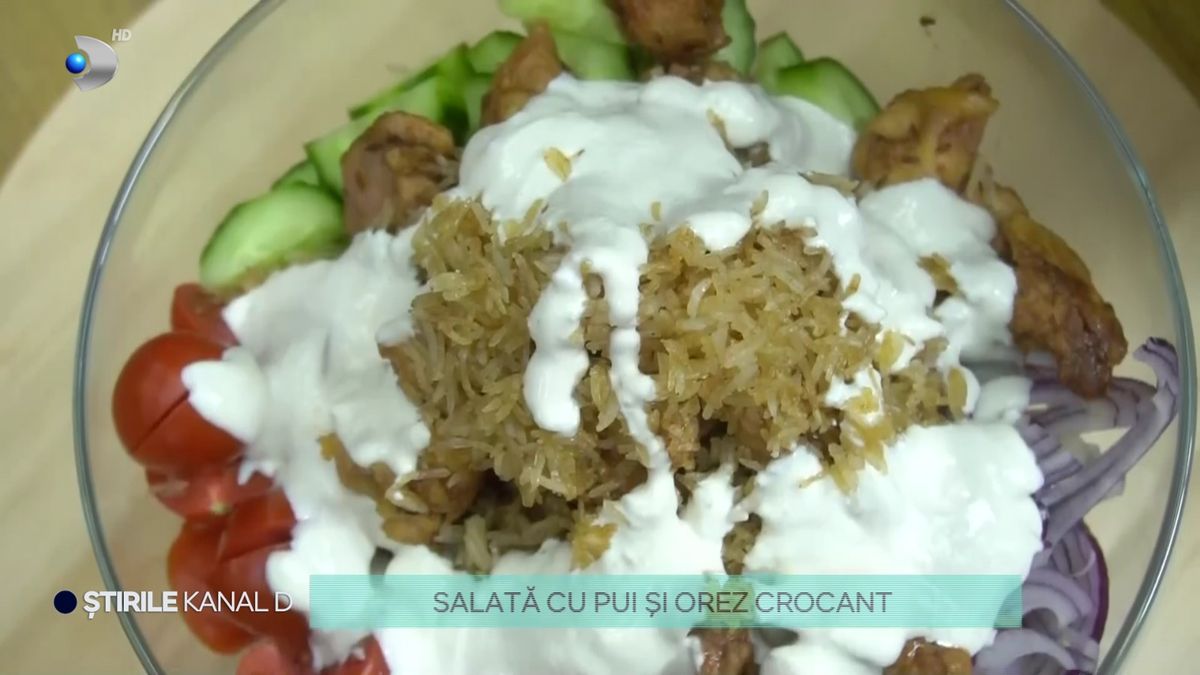 Salata cu pui și orez crocant este un preparat foarte simplu și sănătos.