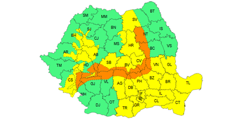 Zone afectate și fenomene vizate: ninsoare abundentă, depunere de strat de zăpadă și viscol la altitudini între 800 și 1700 m în cea mai mare parte a zonei montane. În cea mai mare parte a zonei montane, la altitudini între 800 și 1700 m, va ninge și se va depune strat nou de zăpadă local consistent. Cantitățile de apă acumulate vor fi de 20...25 l/mp. Vântul va avea intensificări, cu rafale de peste 60...80 km/h, va fi viscol, iar zăpada troienită, condițiiîn care vizibilitatea va scădea sub 100 m. În județul Timiș și zona joasă a județului Caraș-Severin în prima parte a zilei va ninge temporar viscolit (rafale de 40...50 km/h), se arată în informarea ANM.