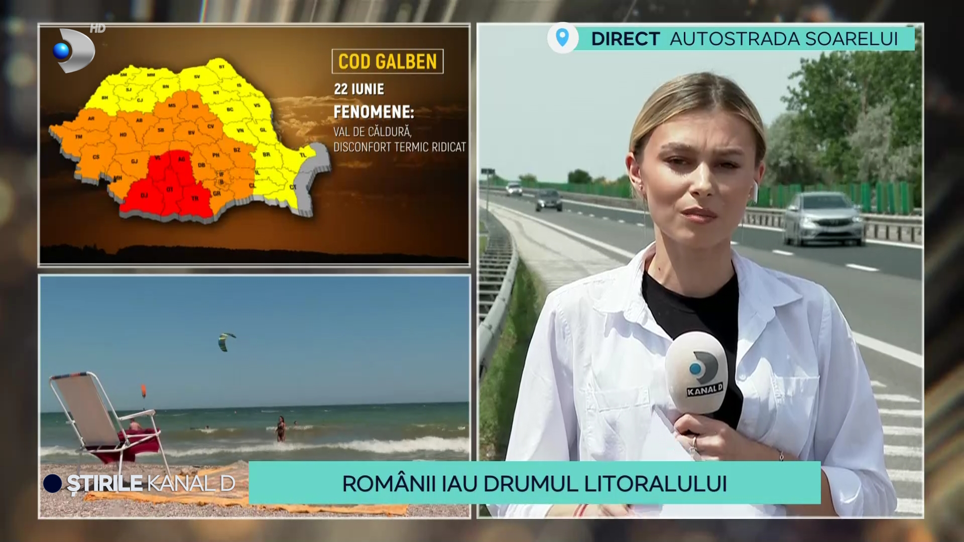 „Românii se pregătesc să ia cu asalt marea în minivacanța e Rusalii. Exodul turiștilor către oaza de răcoare de pe litoral a început deja. Colega noastră, Alexandra Cosman, se află chiar acum pe Autostrada Soarelui și vine cu mai multe detalii”, a spus Cristina Dorobanțu.