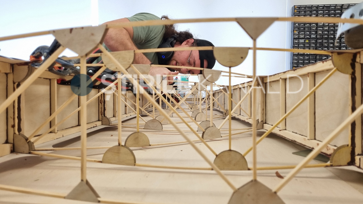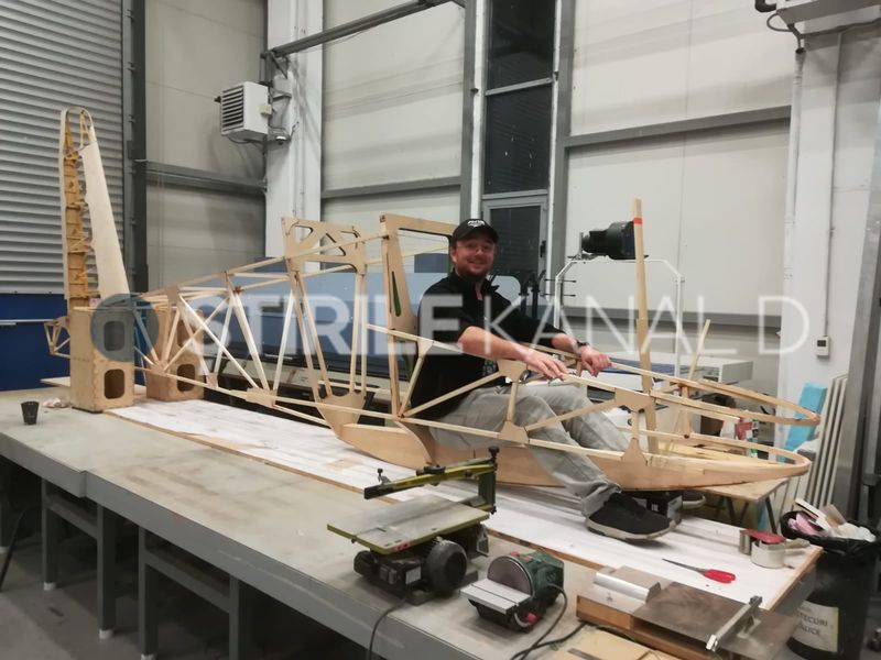 Prima etapă nu a fost nici spectaculoasă, nici rapidă. A început cu ceea ce fotografiile surprind cel mai bine: structura din interior. Fuselajul, o rețea geometrică de zăbrele, pare la început un puzzle fragil. Doar că fiecare bucată din lemn, oricât de subțire ar fi, are un rol precis și o toleranță strictă. Unghiurile nu se negociază, distanțele nu se „aproximează”. Asta pentru că, în zbor, fiecare milimetru contează.