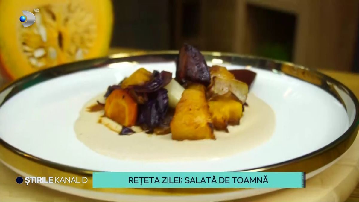 Salata caldă de toamnă reprezintă o combinație de legume de sezon: dovleac, morcovi, sfeclă roșie, varză roșie, ceapă și usturoi. Toate sunt gătite la cuptor pentru a-și păstra aromele și textura.