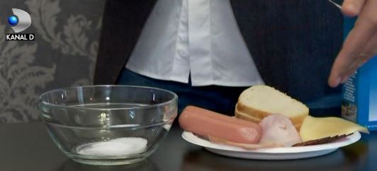 O echipa a Stirilor Kanal D a vrut sa afle cata sare ajungem sa mancam numai la micul dejun. Avem in farfurie muschi file, salam, cascaval, crenvursti, masline si paine.