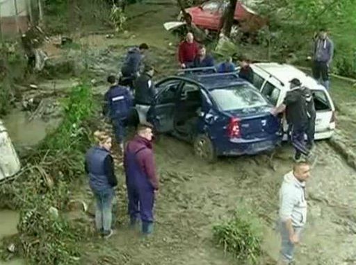 In doar o jumatate de ora, o viitura a facut prapad in localitatea Budesti, din judetul Valcea. Apa a luat pe sus masinile dintr-o parcare si le-a aruncat sub un pod. Oamenii disperati au incercat sa isi scoata automobilele din noroi. In timp ce faceau asta, soferii s-au varsat supararea pe autoritati.