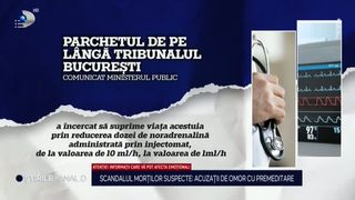 ”Patru medici sunt cercetați în cutremurătorul caz al morților suspecte de la Spitalul Sfântul Pantelimon. Încă doi ani anesteziști au fost aduși azi la audieri, la Parchet, iar la casele lor s-au făcut percheziții. Procurorii au extins urmărirea penală și au descoperit alți patru pacienți care s-au stins după ce li s-ar fi redus dozele de noradrenalină.