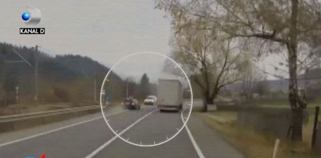 În imaginile se observă gestul absolut halucinant al șoferului inconștient, care nu dă doi bani nici pe viața lui, nici pe a altora. Nu a mai avut răbdare să stea în spatele unui tir și a intrat în depășire în curbă- fără să vadă că din față venea un alt autoturism. Noroc că șoferul acestuia din urmă a fost atent și a tras puternic de volan ca să evite o nenorocire.