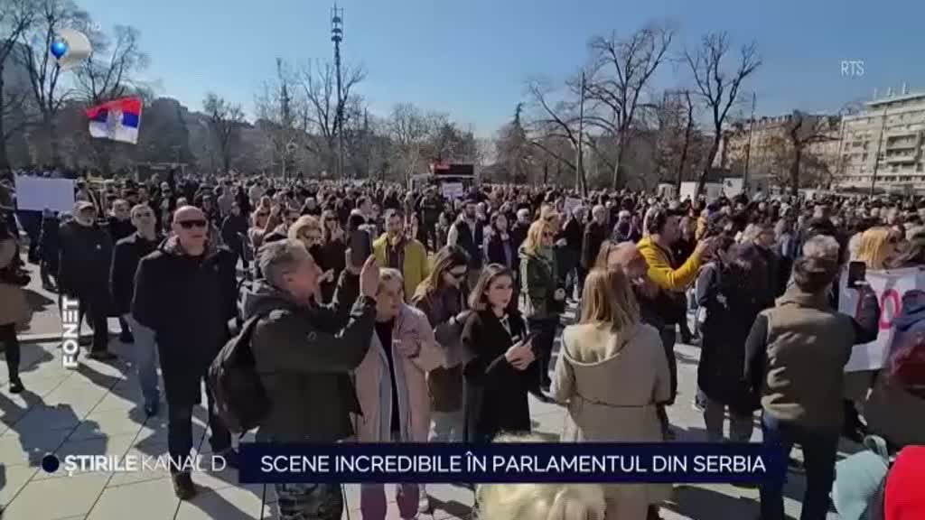 Haos fără precedent în clădirea în care aleșii pun la cale legi pentru bunăstare a Serbiei. Opoziția a aprins torțe ca pe stadion și a început să arunce cu sticle. Președinta adunării generale a fost una dintre victime. Reprezentanții opoziției au vrut astfel să se alăture protestelor studenților care au cerut o finanțare mai bună a sistemului universitar, dar totul a degenerat rapid.