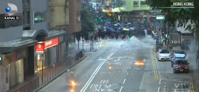 Sute de manifestanti imbracati in negru, cu masti pe fata, au luat cu asalt cartierul in care se afla cele mai multe sedii de banci si companii chinezesti. Revolta lor a provocat fortele de ordine sa raspunda violent pentru a restabili ordinea iar ciocnirile dintre cele doua tabere au adus haosul pe strazile din Hong Kong.