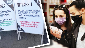 „Intrare exclusiv pentru hypermarket... Intrare generală pentru toți clienții fără prezentarea certificatului digital.”