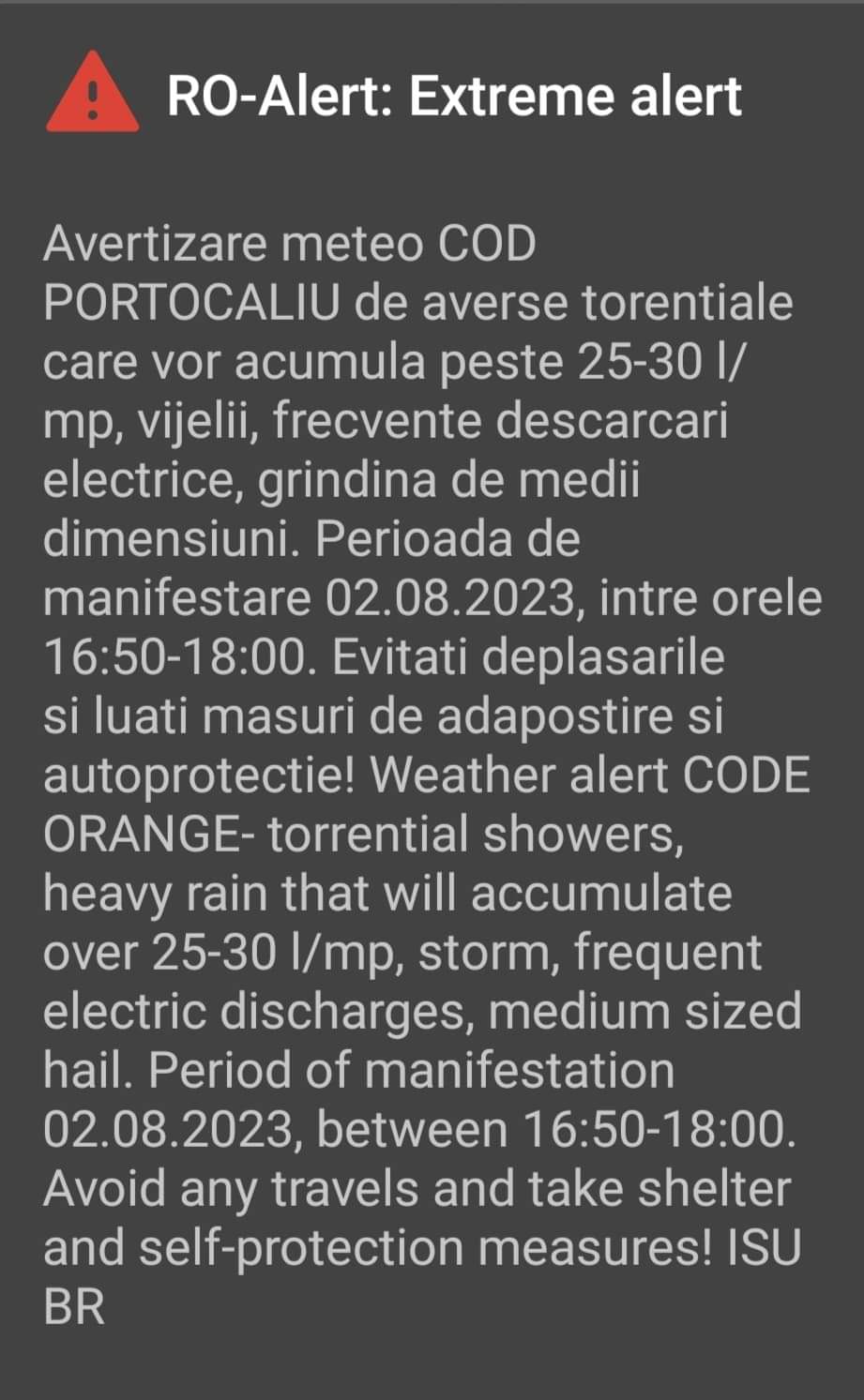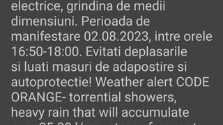 Evitati deplasarile si luati masuri de adapostire si autoprotectie! Weather alert CODE ORANGE- torrential showers, heavy rain that will accumulate over 25-30 l/mp, storm, frequent electric discharges, medium sized hail. Period of manifestation 02.08.2023, between 16:50-18:00. Avoid any travels and take shelter and self-protection measures! ISU BR”.