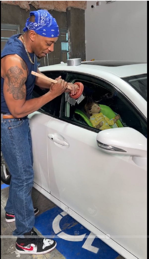 În videoclipul viral postat de Paul Vu pe TikTok, un bărbat care poartă o bandană albastră pe cap stă în fața ușii unei mașini încuiate. În interior se află o păpușă prinsă în scaunul de copil.