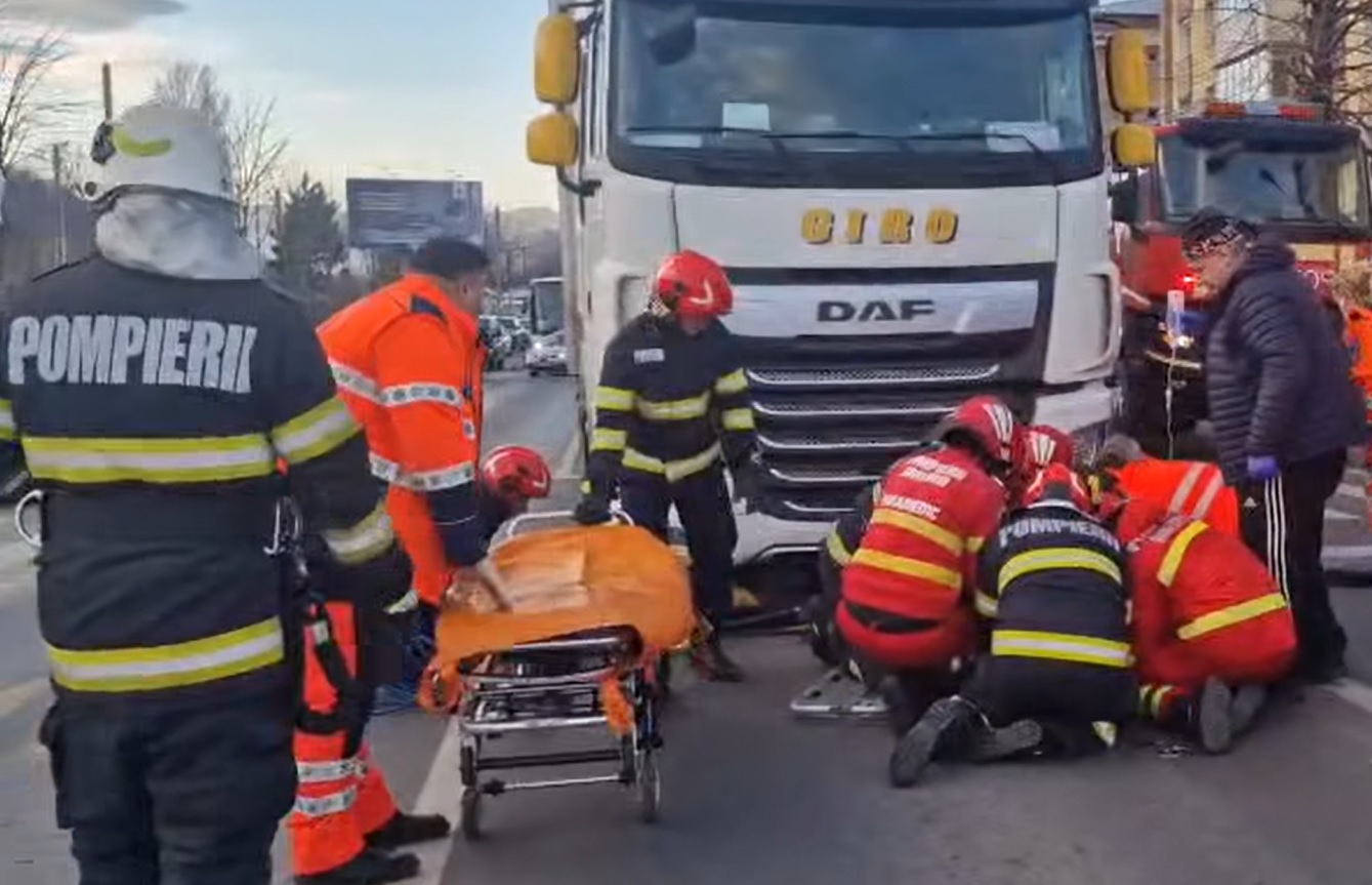 În urma impactului, bărbatul a fost prins sub cabina camionului. La locul accidentului au ajuns mai multe echipaje de pompieri.
