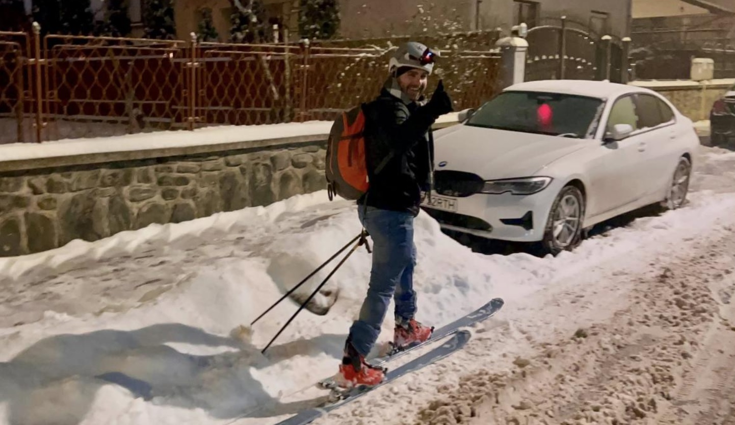 Zăpada de pe străzile din Sibiu i-a dat o idee inedită unui bărbat care nu a stat mult pe gânduri și a plecat la muncă cu schiurile.