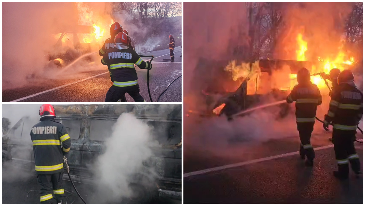 Un incendiu devastator a cuprins un microbuz care transporta persoane, la Iași. Potrivit primelor informații, în auovehicul se aflau 11 muncitori.