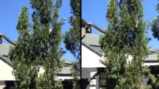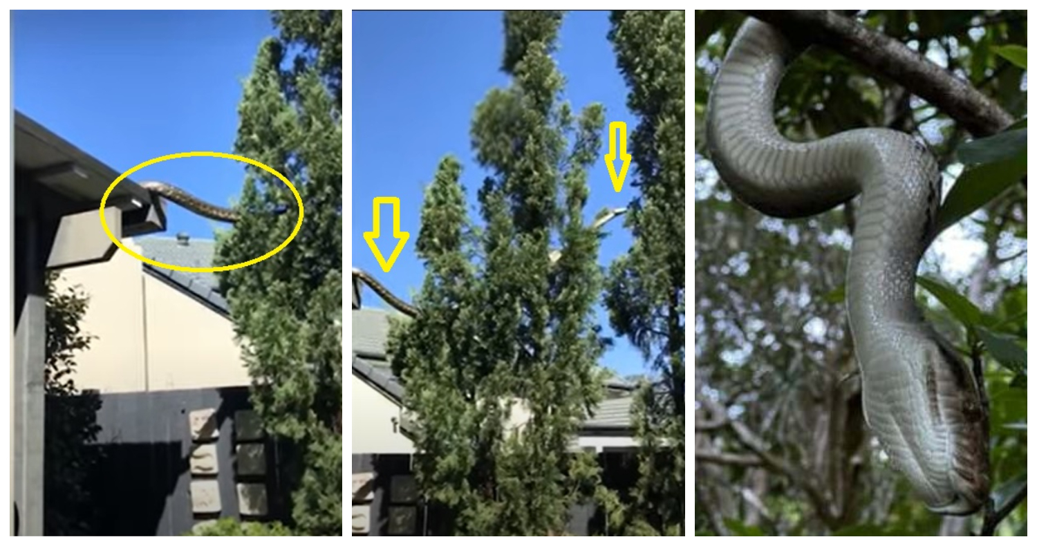 Capul șarpelui apare din frunzișul primului copac înainte de a se muta în alt arbore și pare că se îndreaptă spre o casă vecină.