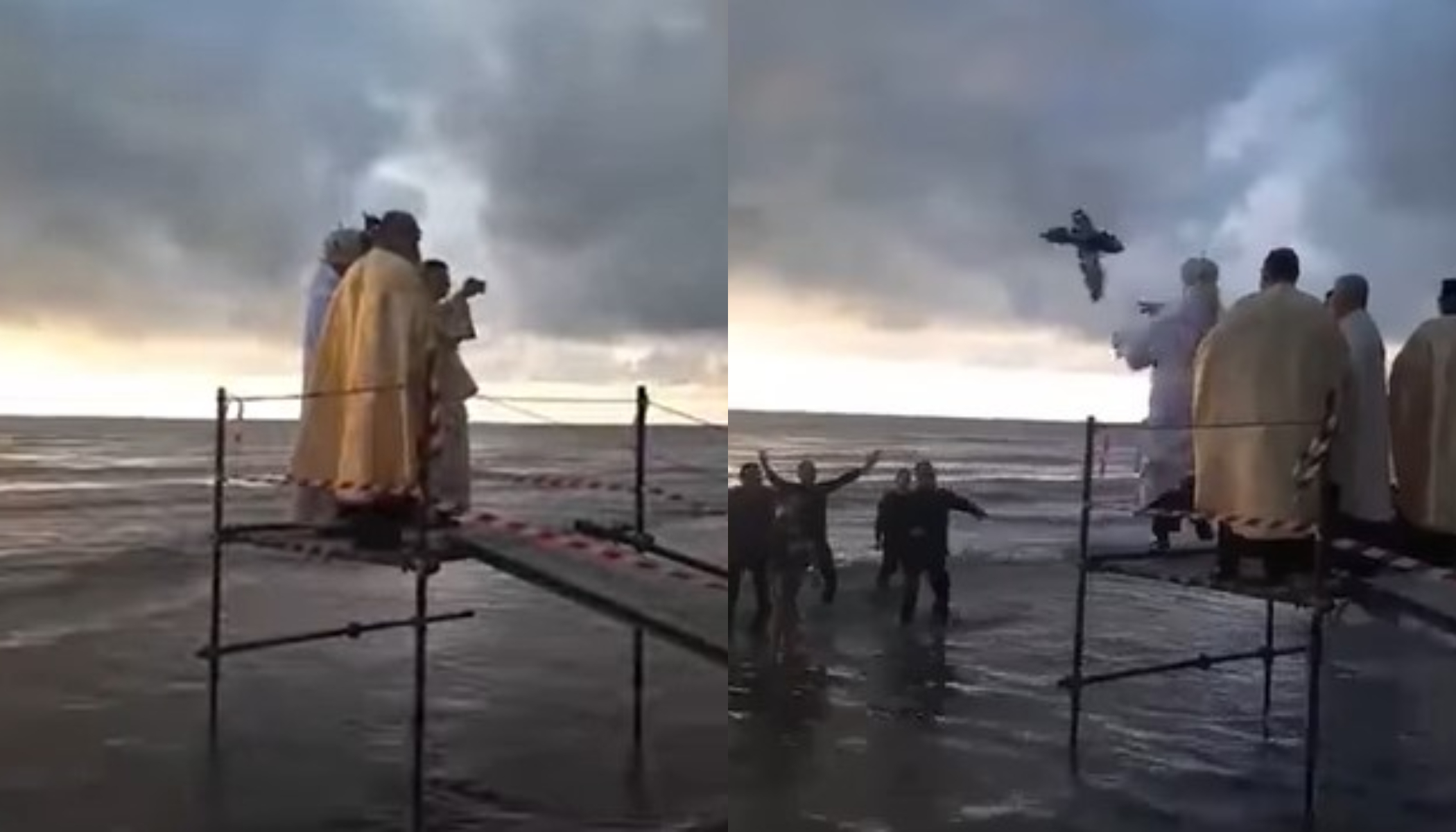 Capetele bisericești au urcat pe o platformă pentru a arunca crucea în mare. Printre ei se afla și preotul român care a ajuns direct în apă, după ce s-a dezechilibrat și a căzut.