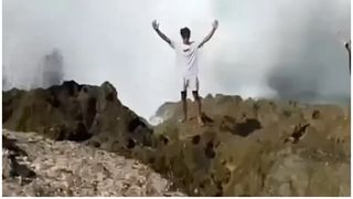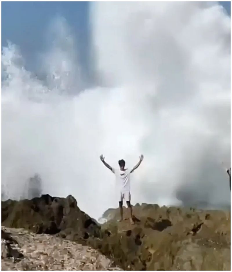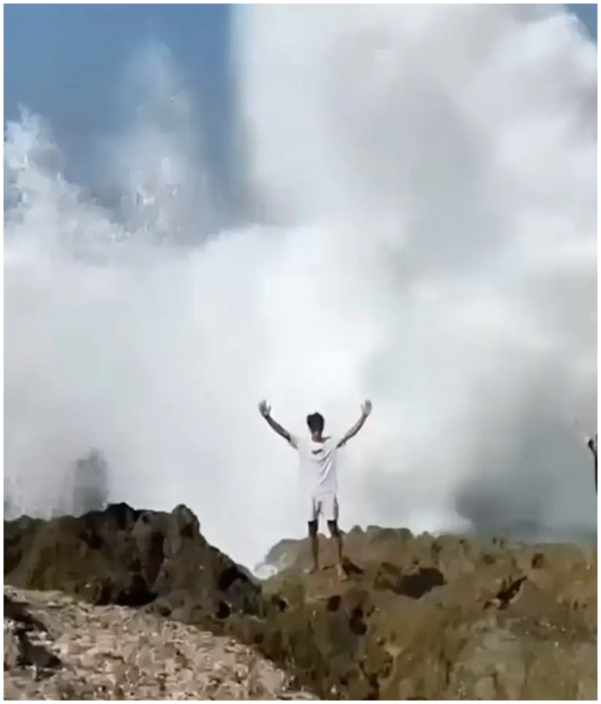 Videoclipul postat pe rețelele de socializare cu incidentul înfiorător arată momentul în care Roni a fost învăluit de un val masiv și tras în Oceanul Indian.