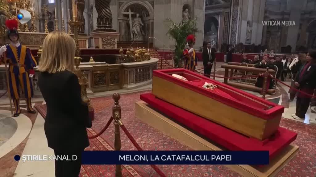 La un moment dat, în mijlocul mulțimii de credincioși și lideri spirituali, și-a făcut apariția și premierul Italiei. Vizibil marcată, Georgia Meloni a stat câteva clipe în tăcere lângă catafalc, și-a plecat capul și s-a rugat.