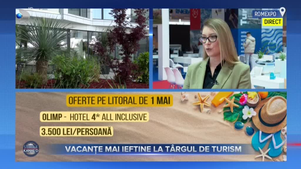 „Astăzi se deschide Târgul de Turism din Capitală, unde vor fi lansate pachete de vacanță pentru toți cei care vor să își programeze concediile din timp. Colega mea, Larisa Rațiu, este chiar acum acolo și ni se alătură cu detalii”, a transmis Simona Pătruleasa, prezentatoarea Știrilor Kanal D.