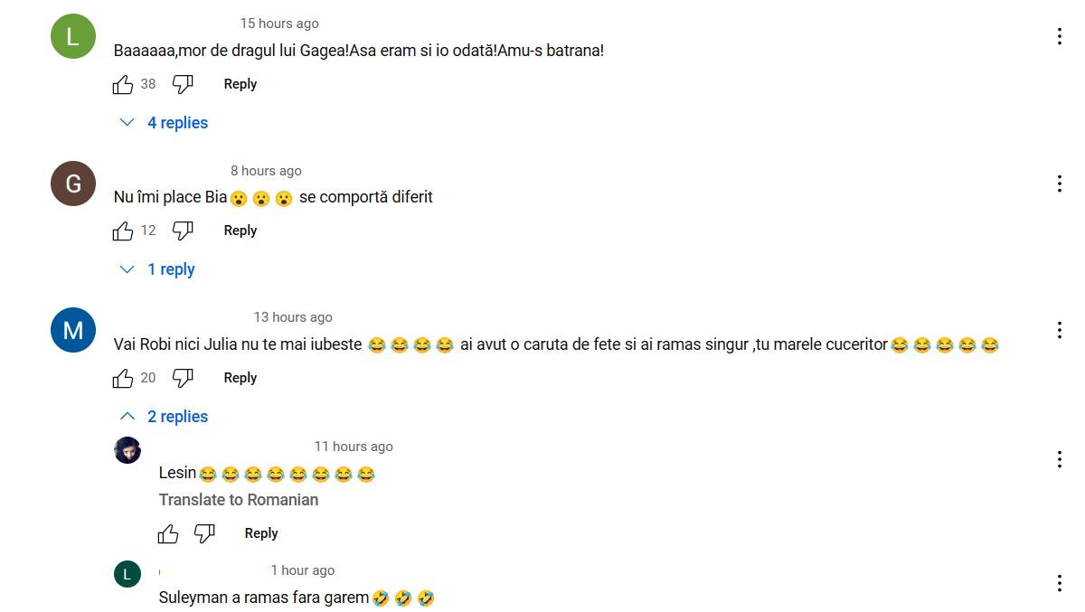 "Vai, Robi, nici Julia nu te mai iubește! Ai avut o căruță de fete, dar ai rămas singur, tu, marele cuceritor", l-a luat la rost o telespectatoare a emisiunii Casa Iubirii pe contul oficial de Youtube.
